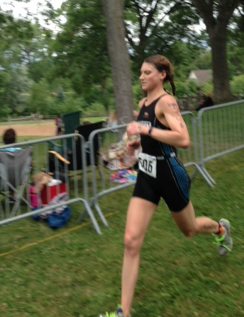 ChisagoRunOutI was in and out of T2 fairly quickly and off on the run, which is always the most challenging part of the day for me. Thankfully the first part of the run is a nice little down hill which helped set a good pace from the get go. Unfortunately, soon after that, you run through some gravel, up a slight hill that feels like it slows you to molasses and then through the grass, finally reaching some solid ground to get back on pace. I was feeling pretty good still at this point but I never want to burn all the gas right away, so I settled in at what felt like a strong pace. When I hit mile 1 I didn’t bother to look at my watch as I felt I was pacing pretty well and I didn’t see Dan headed back my way yet (it was an out and back run). I skipped the water stop at the half way mark, as I was still feeling good and only had a little over a mile to go. Turning back to the main drag, Kyle Serreyn was headed to the turn around putting him approximately two blocks behind me. I had just checked my watch to see that I was still in good shape on time, since my body wasn’t completely rejecting me this was great motivation for me to push the pace on the way home and go outside my comfort zone.