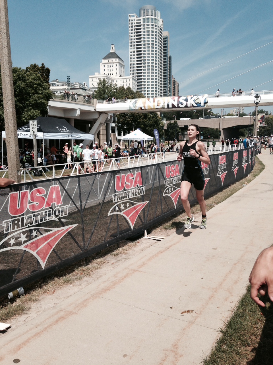 photo 1-2Disappointed in my bike, I knew I had to keep moving on the run. At this point it was near noon, the sun was high with zero clouds and there was shade for, maybe, a mile total out on the course. I got a time update from my Dad running out of transition and my first thought was, no way can I win. I knew right away that I needed to get that thought out of my head, so I set my goal to reach the end of the pier, a little over a mile away. From there on out I was taking it mile by mile. I was nervous to look at my watch but at mile three I glanced at my split and I was running 6:33s (very fast Olympic pace for me) but that ended quickly. I was looking forward to the mile 4 turnaround knowing they had cups of ice. I was able to pour the ice down my suit and hold it in my hands and mouth to try to keep cool. The last two miles went poorly and at mile five I wanted to walk badly but I knew I’d never forgive myself if I did that. For the last mile I counted my steps as a distraction. Coming up on the 6-mile marker, I knew I could survive approximately two more blocks.